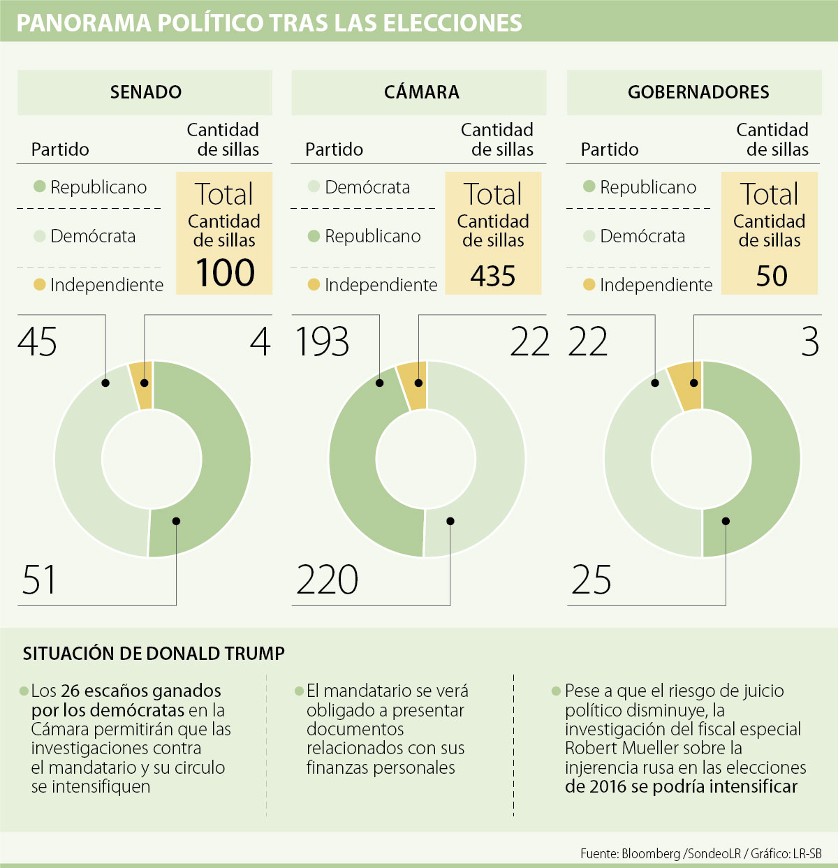 La conclusión de las elecciones ‘mid term’ en Estados Unidos dejó como resultado un escenario ambiguo para Donald Trump. A pesar de que el Partido Demócrata no obtuvo la mayoría en el Senado, sí lo hizo en la Cámara de Representantes, lo que le permite limitar el poder del mandatario y efectuar mayor presión sobre él en torno a las investigaciones que ya pesan en su contra.