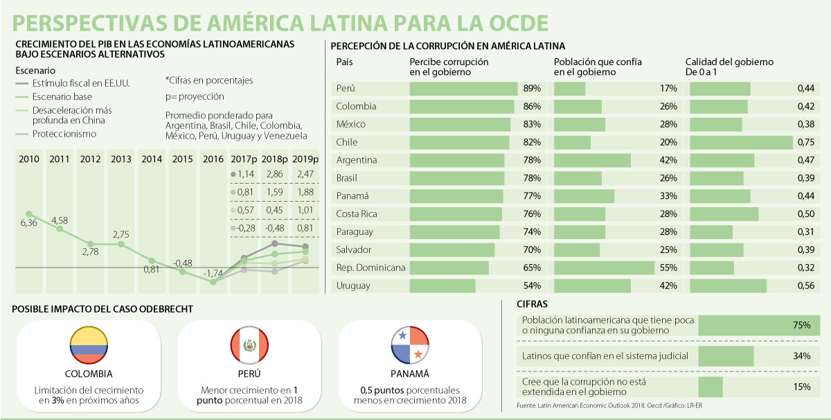 Según la Ocde, el caso Odebretch podría perjudicar económicamente a varios países por la detención de las obras de la empresa. En Colombia podría limitarse en 3% el crecimiento en los siguiente tres años tras retrasos en el proyecto del tramo de carreteras de la Ruta del Sol y del proyecto de navegabilidad del Río Magdalena. En Perú, la parálisis del gasoducto ha rebajado el crecimiento en casi un punto porcentual este año. Mientras Panamá podría restar 0,5 puntos en 2018 si se cancela un proyecto hidroeléctrico.