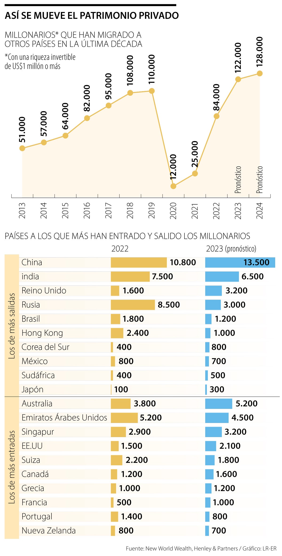 Tomando los datos de New World Wealth, firma de investigación independiente que lleva una década rastreando las tendencias de migración de riqueza global de las personas más ricas entre países y ciudades de África, América, Asia Pacífico, Europa, la Comunidad de Estados Independientes (CEI) y Oriente Medio, Henley & Partners construyó el panel de migración global de millonarios que se mudaron de país.