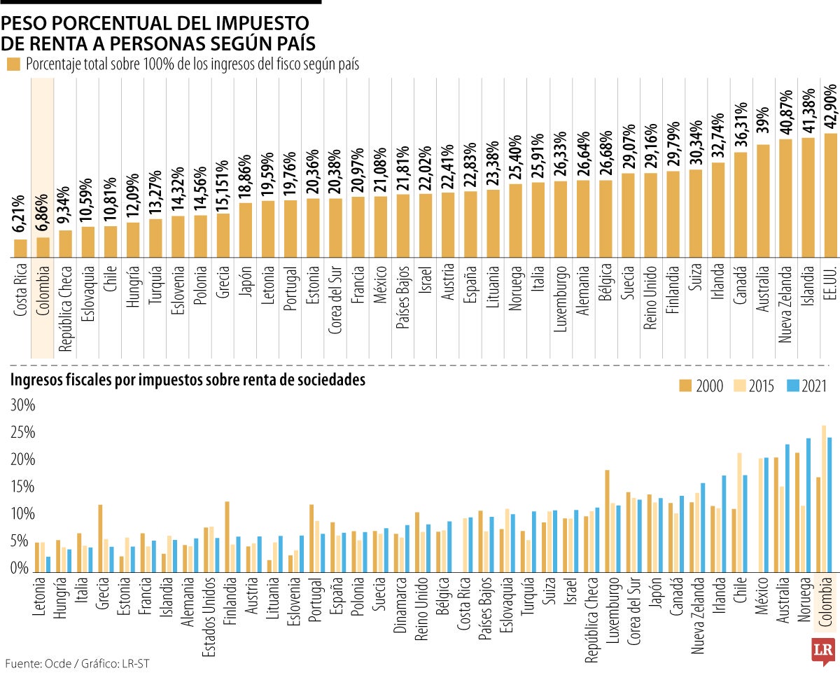 Según la Ocde, con datos hasta 2021, (último condensado de todos los países del bloque), el país de menor recaudo por renta de personas naturales es Costa Rica, con 6,2% sobre el total de los impuestos, luego viene de segundo Colombia con 6,8%, por debajo del promedio de la Ocde de 23,7%.