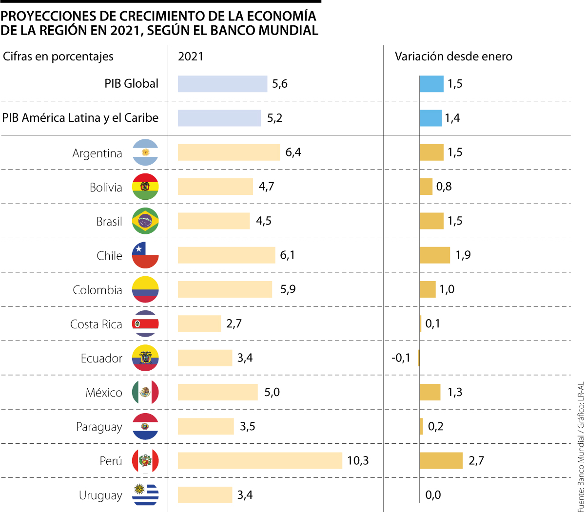 A pesar de que América Latina fue una de las regiones más afectadas por la pandemia, cerrando 2020 con una contracción en su PIB de 6,5%, las estimaciones de la entidad pronostican un crecimiento positivo de 5,2% que se ubica 1,4 puntos porcentuales sobre la referencia de inicio de año.