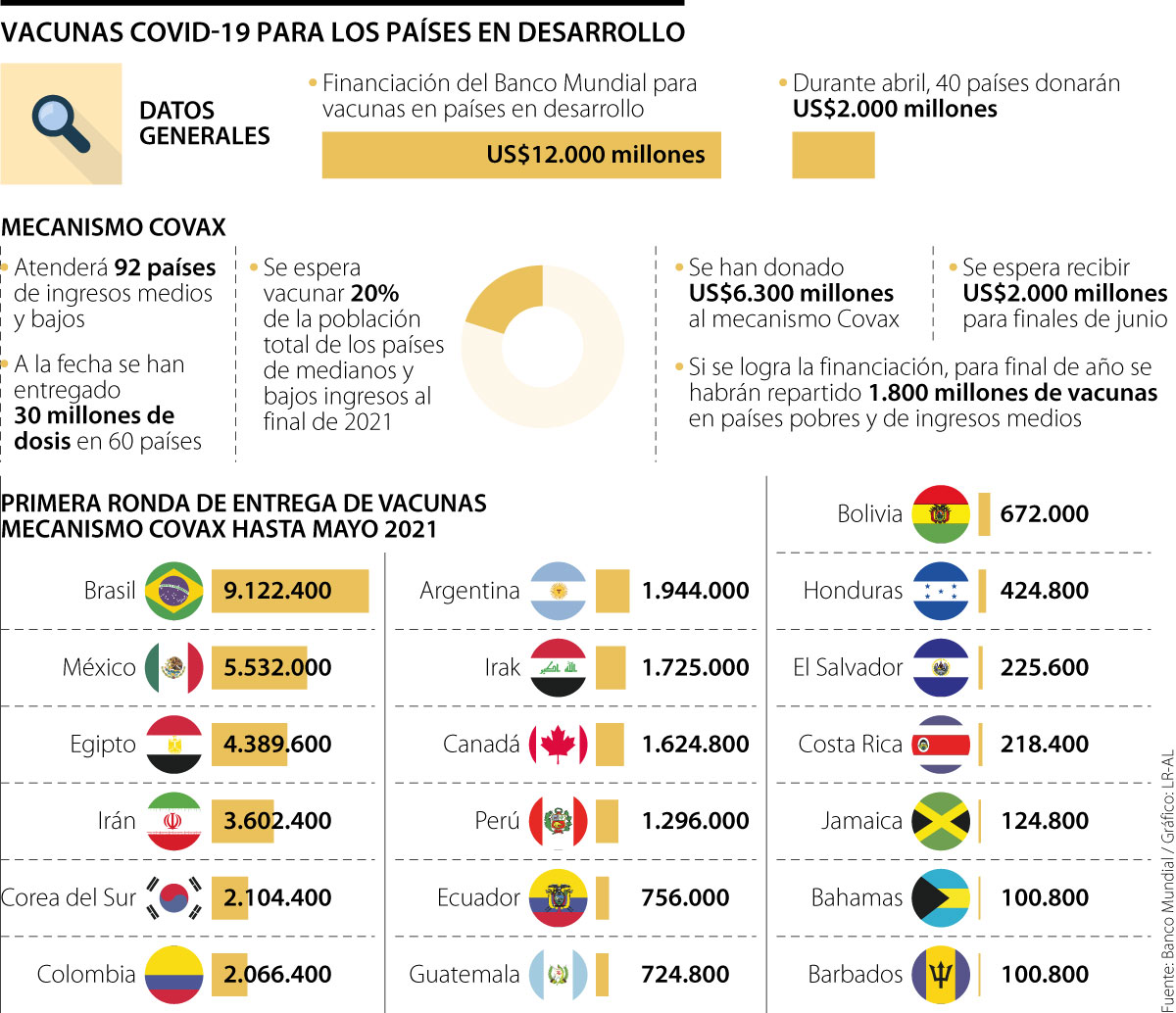 Por esta razón, el Banco Mundial ha destinado un monto de financiación de US$12.000 millones para alentar los procesos de vacunación en los países de ingresos medios y bajos, así como anunció una colaboración con 40 países del mundo para comprometer otros US$2.000 en financiamiento de la inoculación y US$4.000 millones más para impulsar la producción de vacunas y acelerar los proyectos de investigación sobre los biológicos.