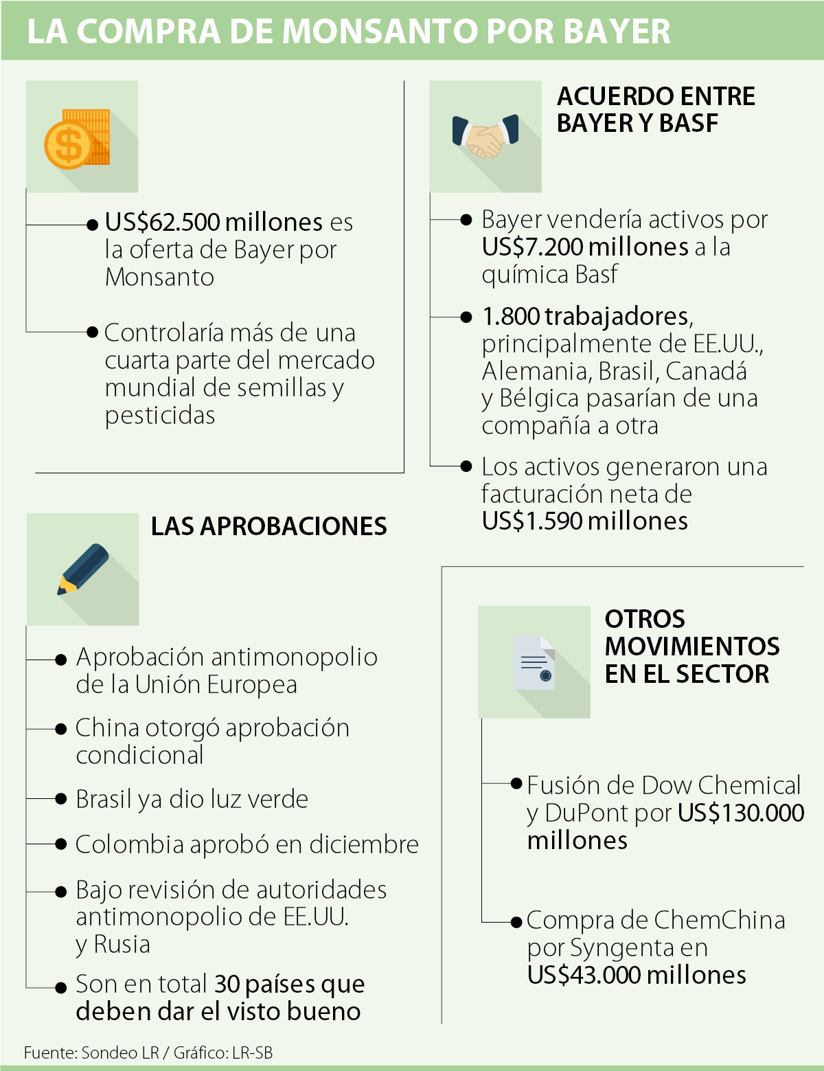 En un comunicado, Bayer asegura que más de la mitad de las aprobaciones necesarias (30 países, incluyendo la Unión Europea como uno solo) ya se han realizado. China otorgó aprobación condicional, Brasil aprobó en febrero y en el momento el acuerdo se encuentra bajo revisión de autoridades antimonopolio de EE.UU. y Rusia. En el caso local, Colombia aprobó la fusión por medio de la Superintendencia de Industria y Comercio, desde diciembre de 2017. Raúl Ávila, experto en industria de la Universidad Nacional, consideró que la aprobación estadounidense será más demorada, “en especial en épocas de Gobierno Trump en cualquier sector. Los temas de competencia con patentes y demás es más demorado y difícil de tener en EE.UU. por temas de lineamientos de restricción a políticas de concentración”.
