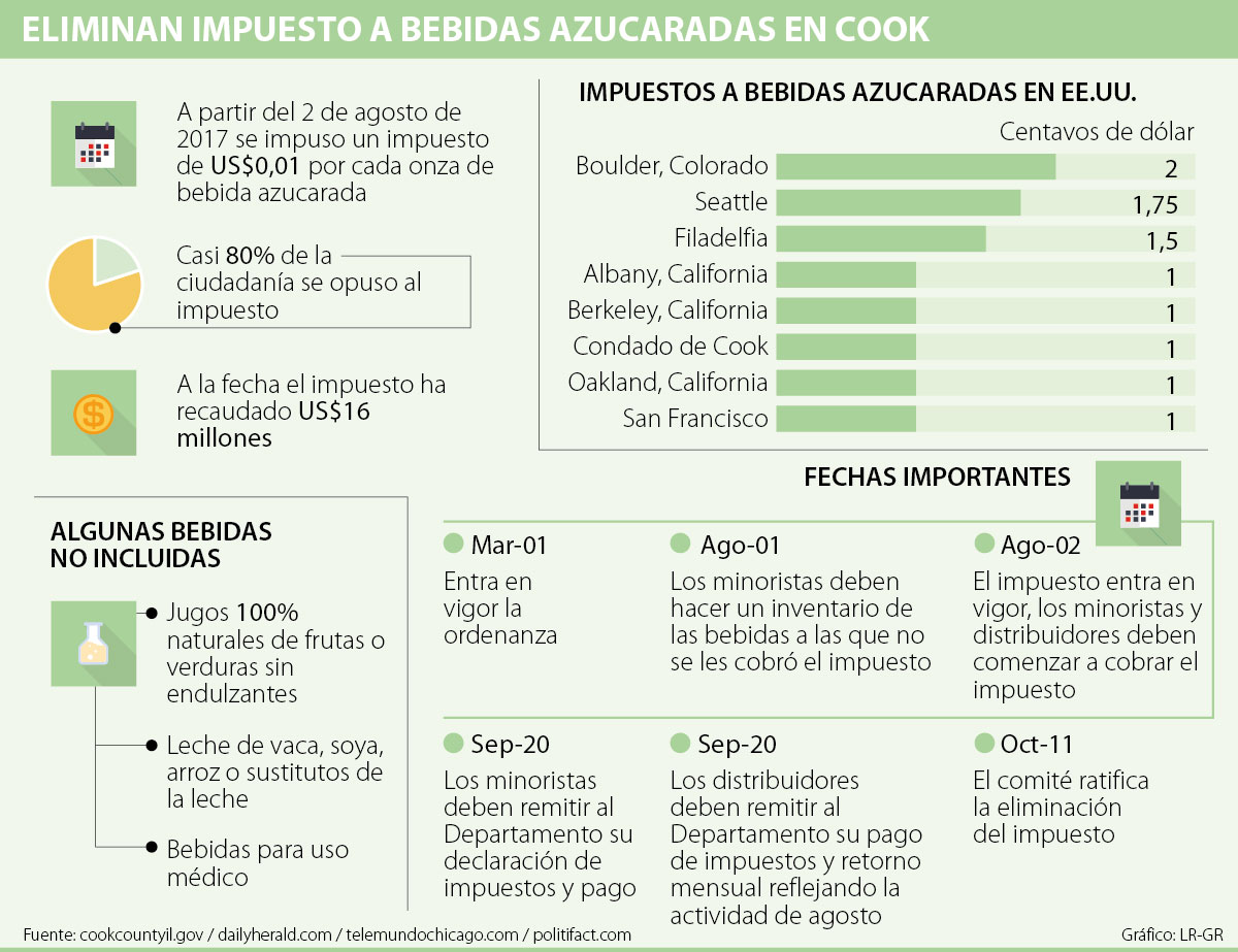El año pasado, en noviembre, la Junta de Comisionados del condado aprobó la ordenanza de impuestos sobre bebidas azucaradas en esta zona, gravándole US$0,01 a cada onza de estos productos. Los motivos expuestos por Toni Preckwinkle, presidenta de la Junta, para aprobar y promover la medida, fueron mejorar la salud pública y apoyar, con US$200 millones adicionales, la brecha presupuestaria que tiene esta zona de Chicago que asciende a US$1.800 millones.