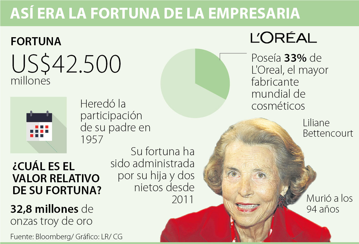 La heredera de L’Oréal falleció ayer a los 94 años de edad, con una fortuna de US$42.500 millones según el índice de multimillonarios que elabora Bloomberg. Bettencourt todavía poseía 33% del mayor fabricante mundial de cosméticos, tras heredar la empresa de su padre cuando falleció en 1957. Al control de la firma, estuvo François Dalle quien lideró la transformación de la compañía.