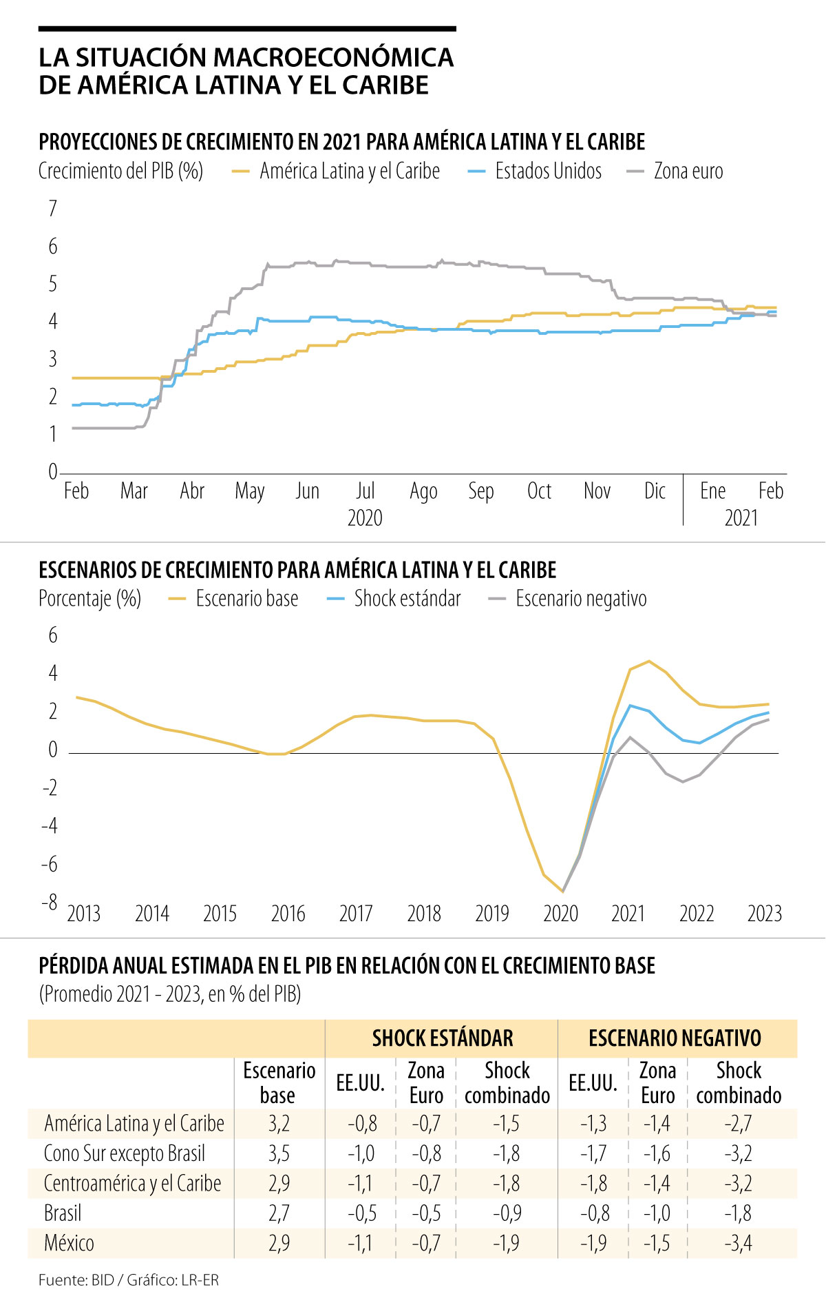 Ahora bien, bajo un escenario crítico, según el BID, la recuperación económica de la región podría limitarse a un crecimiento de 0,8% en 2021, lo que dejaría un impacto negativo en 2022 con una contracción de 1,1%, para ver finalmente una recuperación positiva de 1,8% hasta 2023.