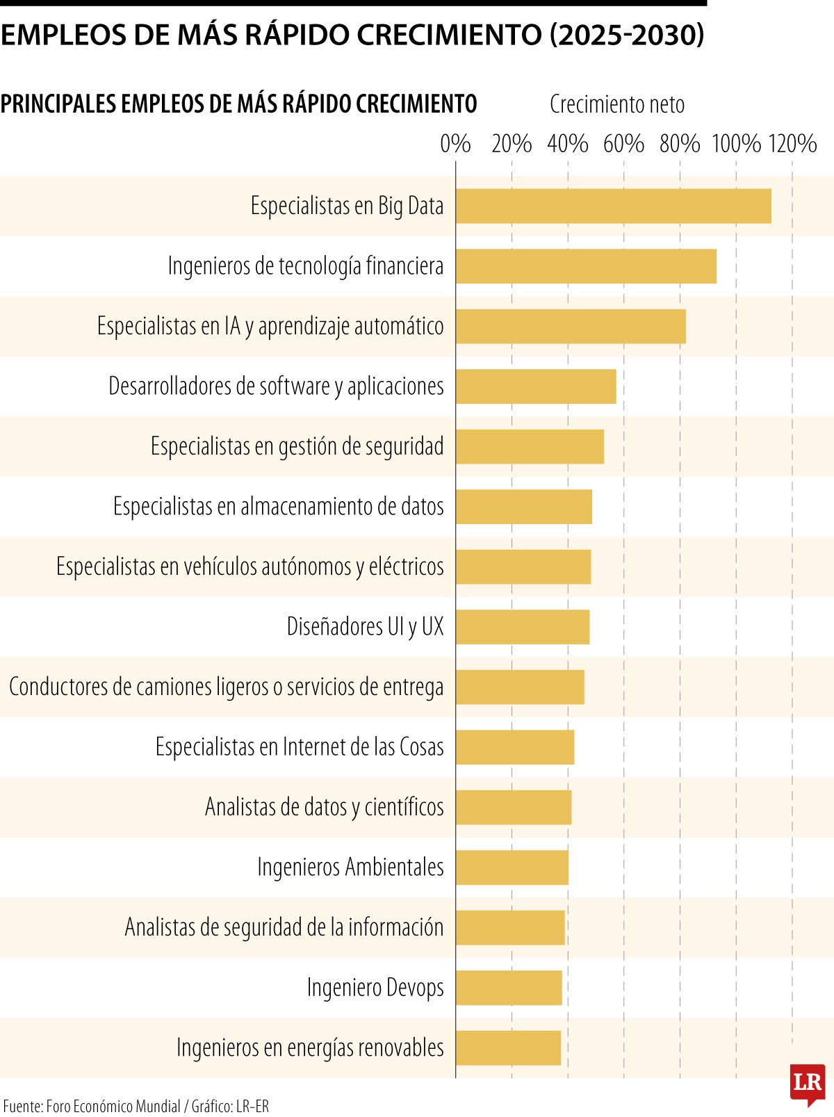 El Foro Económico Mundial publicó su informe sobre el futuro del empleo para este año. El documento llamado ‘The Future of Jobs Report 2025’ encontró que los puestos laborales de más rápido crecimiento para 2023, en términos porcentuales, estarán impulsados por avances tecnológicos en inteligencia artificial y robótica .