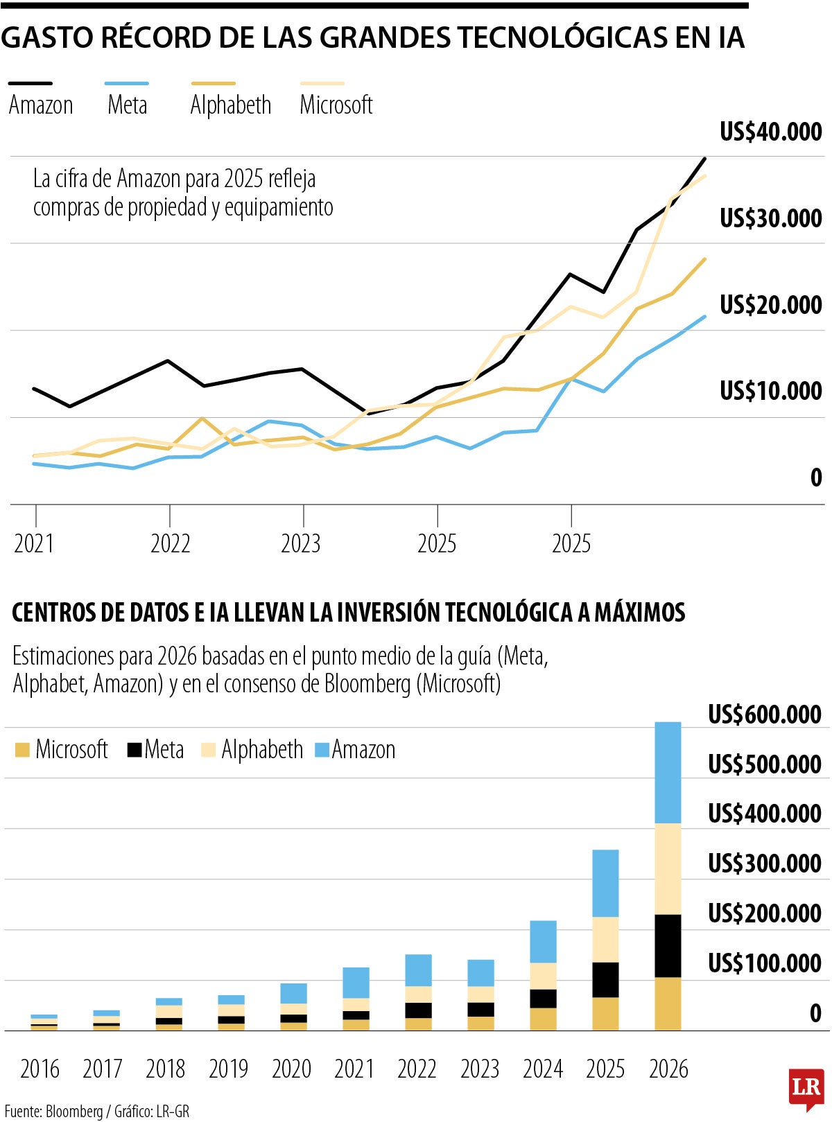 Alphabet sacudió a los inversores el miércoles cuando reveló una previsión de gasto de capital que superó no solo las estimaciones de los analistas, sino también el gasto de una gran parte de la industria estadounidense: planea invertir hasta US$185.000 millones. Y Amazon fue aún más lejos el jueves, con un plan de US$200.000 millones en gastos de capital para 2026, lo que también hizo caer sus acciones en operaciones postmercado.