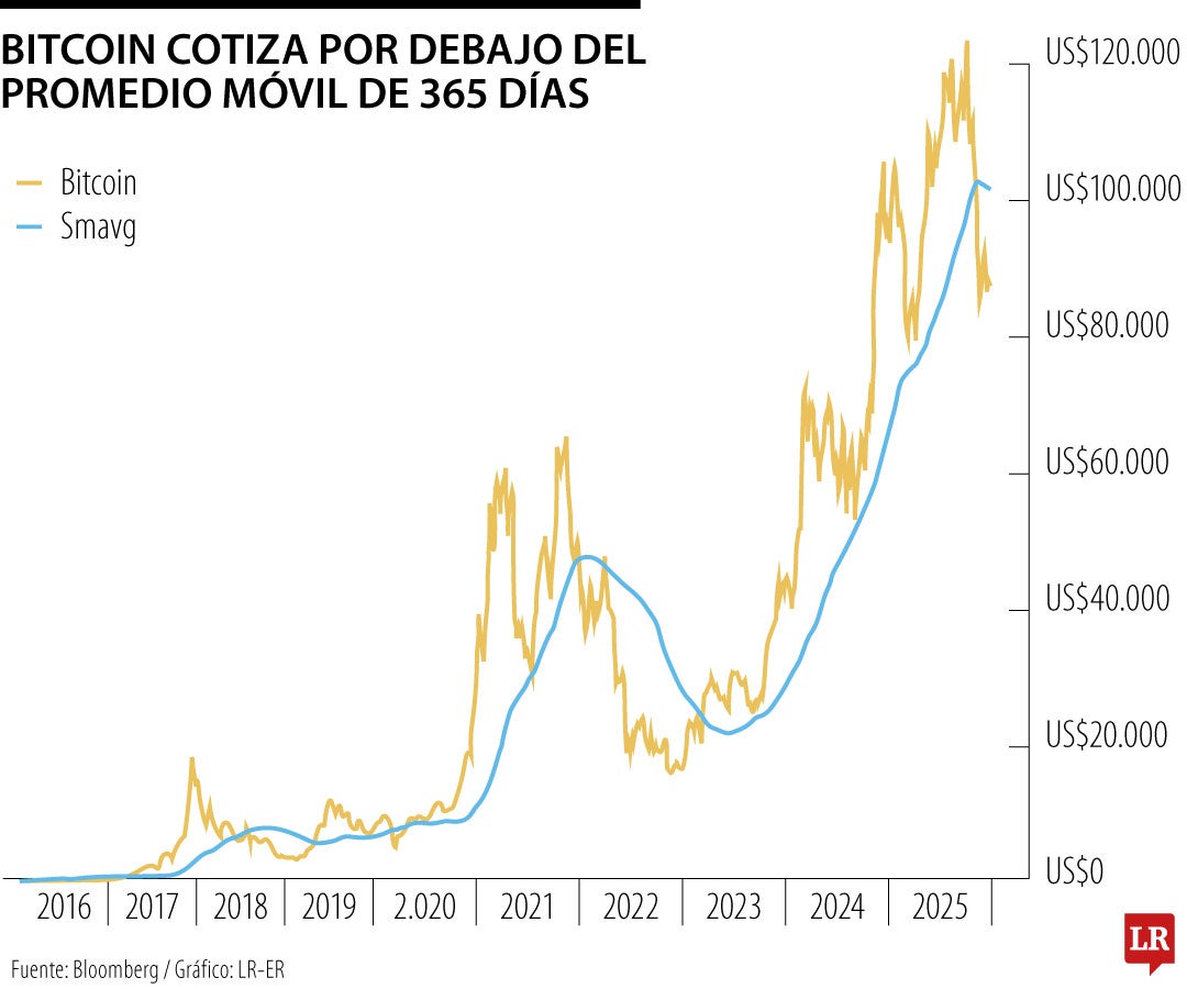 Parte de la inercia es técnica. Bitcoin ha caído por debajo de su media móvil de 365 días cerca de los US$102.000, un nivel que había actuado como soporte clave durante el ciclo actual. El hecho de no recuperar ese umbral ha aumentado el riesgo de un retroceso más profundo.