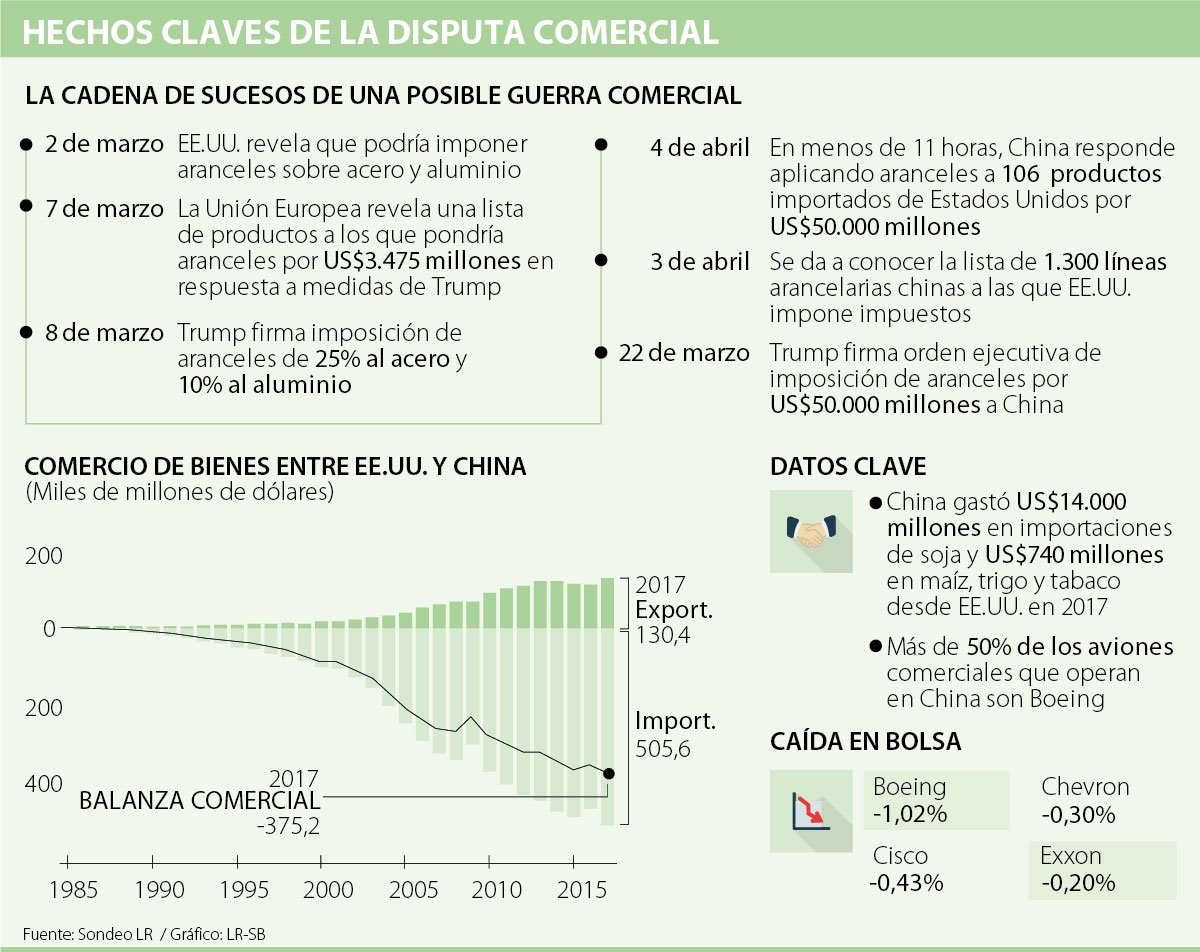 Menos de 11 horas después de que Estados Unidos publicara la lista de 1.300 productos chinos a los que les aplicará aranceles, el Gobierno asiático reveló los 106 bienes de las importaciones de origen estadounidense a los que les impondrá aranceles de hasta 25%, equivalentes a cerca de US$50.000 millones e igualando así la medida de los norteamericanos. Esta lista incluye productos como la soja, diferentes tipos de trigo, aviones, automóviles, productos químicos, carne de res congelada y algodón, entre otros.