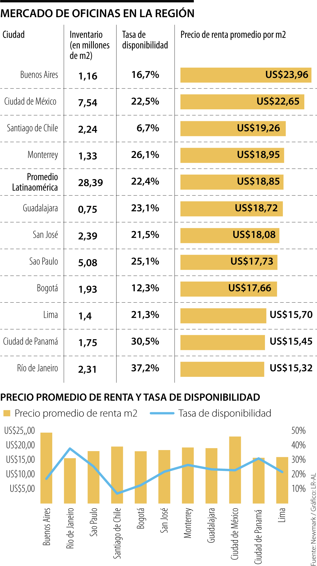 Santiago de Chile tuvo el tercer precio de renta promedio más alto en US$19,26. Al respecto, Newmark destacó que, aunque la tasa de disponibilidad de oficinas clase A en la ciudad ha venido en aumento en los últimos siete trimestres, es la más baja de la región, y es es la única que tiene el dato en un solo dígito: 6,7%.