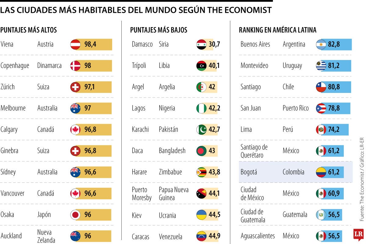 La revista The Economist en sus especiales de cierre de año actualizó el famoso Global Liveability Index, un ranking en el que mide la habitabilidad de las ciudades, dándole a cada una un puntaje de cero a 100. Los lugares se clasifican según su estabilidad, asistencia sanitaria, cultura y medio ambiente, educación e infraestructura.