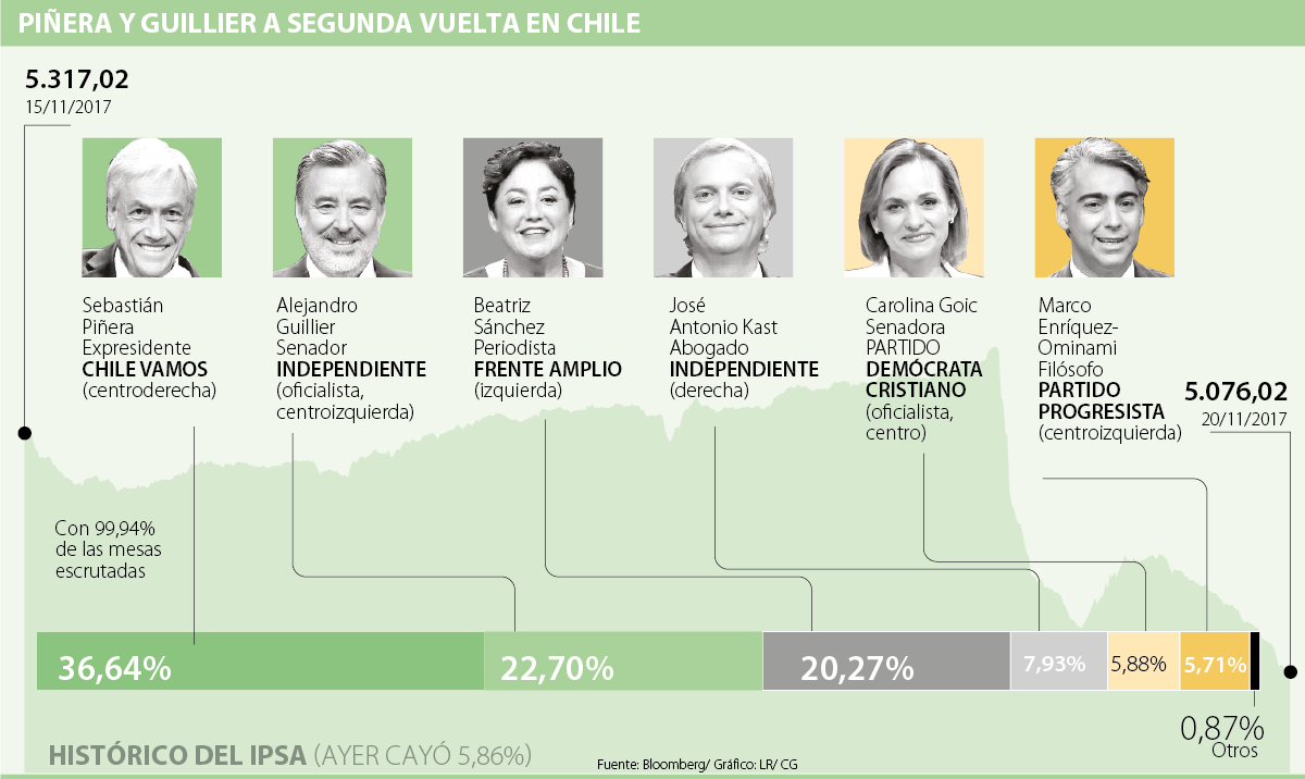 El mercado esperaba que Sebastián Piñera obtuviera más de 40% de los votos y que se fuera a segunda vuelta con Alejandro Guillier, quien se esperaba que obtuviera un poco menos de 20% de los votos.