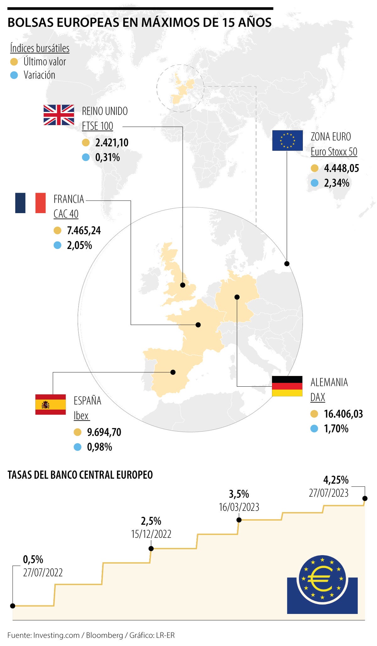 Las bolsas europeas alcanzaron su nivel más alto desde febrero del año pasado después de que el Banco Central de la región subiera los tipos de interés, tal y como se esperaba, al tiempo que mantenía abiertas las opciones para la próxima reunión, lo que tranquilizó a los inversores al considerar que los responsables políticos se acercan al final de su ciclo de endurecimiento monetario.