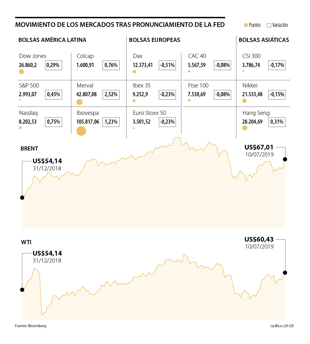 Juan David Ballén, jefe de investigaciones económicas de Casa de Bolsa, destacó que “entre las intervenciones de Powell sugirió la posibilidad de dejar un espacio para disminuir la tasa de interés de manera preventiva, con el fin de darle un impulso a la economía”. Explicó que estas variaciones en los mercados se dan porque “la expectativa por una mayor liquidez genera un apetito por activos de riesgo”.