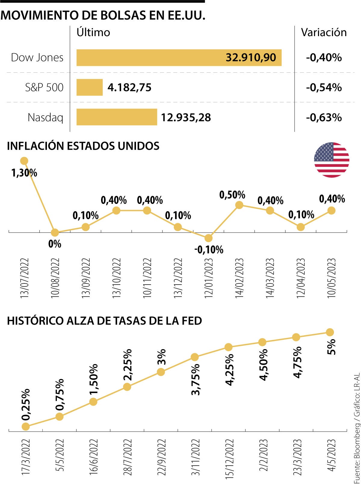 Los mercados cerraron la jornada en rojos como respuesta a la incertidumbre que vive EE.UU.. Por un lado, el Congreso sigue sin definir si aprueba o no el proyecto del techo de deuda y, por el otro, funcionarios de la Fed dicen que se tiene sobre la mesa saltarse la subida de tasas en junio.