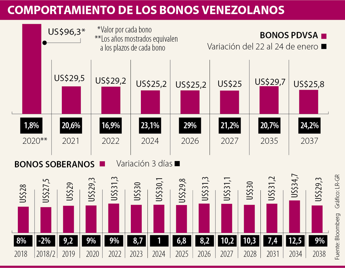 El pasado miércoles 23 de enero, mientras manifestantes llenaban las calles de Caracas, en Wall Street los bonos del gobierno de Venezuela y los de su petrolera Pdvsa registraron movimientos que no se veían desde hace más de un año.