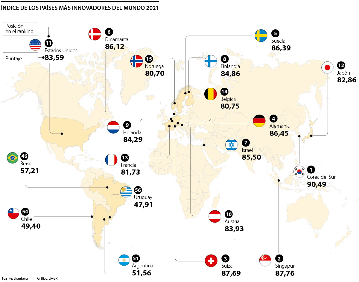 De acuerdo con el índice de países más innovadores del mundo 2021, publicado por Bloomberg, este año la economía más innovadora del planeta es Corea del Sur que logró un puntaje de 90,49 sobre 100 posibles, y destronó a Alemania que cayó al lugar número cuatro, con 86,45 puntos.