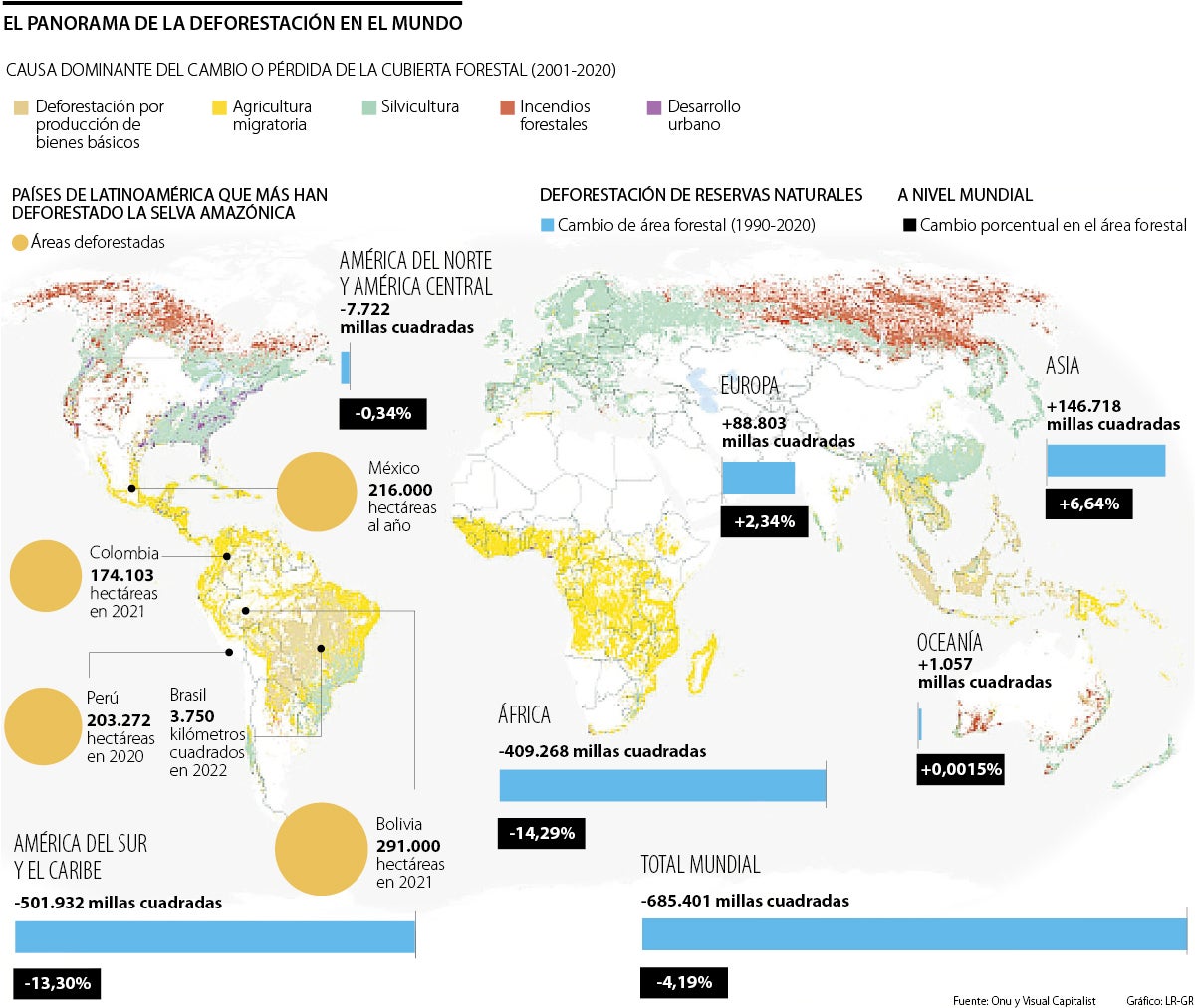 Los países de Latinoamérica que han deforestado la mayor parte de este territorio son: Brasil, Bolivia, Perú y Colombia, según datos de Global Forest Watch. En el resto del mundo los países que más han deforestado sus reservas naturales son Indonesia, en Asia, y la región del Congo, en África.