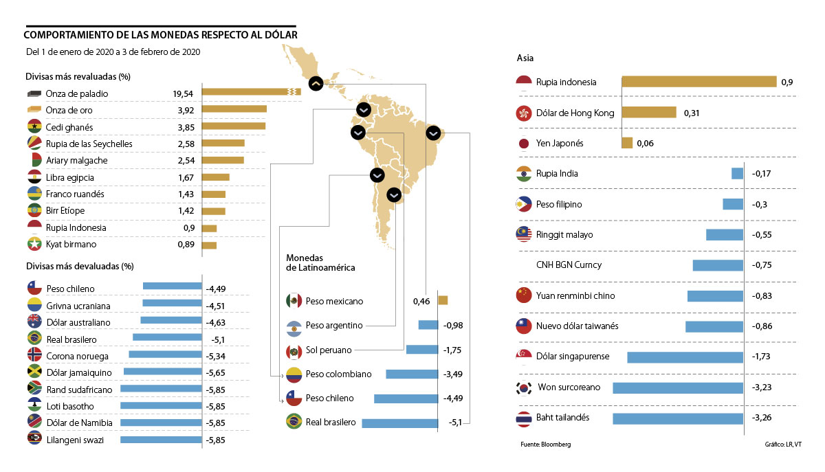 No todas las monedas de la región cerraron en rojo durante el primer mes del año. La que presentó el mejor comportamiento fue el peso mexicano, el cual ascendió 0,46%. Según Reuters, “el peso mexicano y la bolsa avanzaban con firmeza el martes 4 de febrero tras estímulos anunciados por China para aminorar el impacto de una epidemia de coronavirus”.