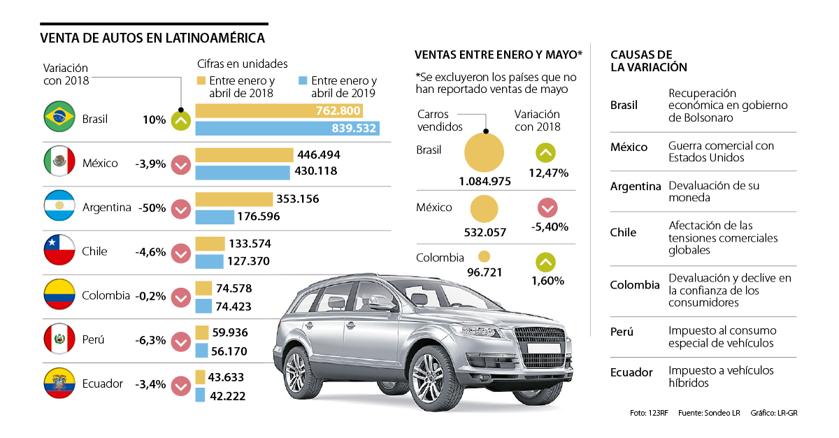Las ventas de vehículos en los países de la región no tuvieron un comportamiento positivo en los cuatro primeros meses del año. Tras un sondeo elaborado por LR, que incluyó siete naciones de América Latina, la comercialización de carros cayó en la mayoría de los mercados, con excepción de Brasil.