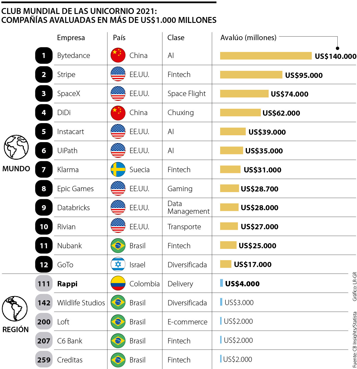 El listado que está encabezado por ByTendance, la compañía China de inteligencia artificial de más de US$140.000 millones y empresa matriz de la plataforma digital TikTok, reveló que los unicornios existentes en este momento suman un avalúo combinado de US$2,2 billones y resaltó la presencia de 15 nuevos startups ubicadas en América Latina, de las cuales 11 se fundaron en Brasil.
