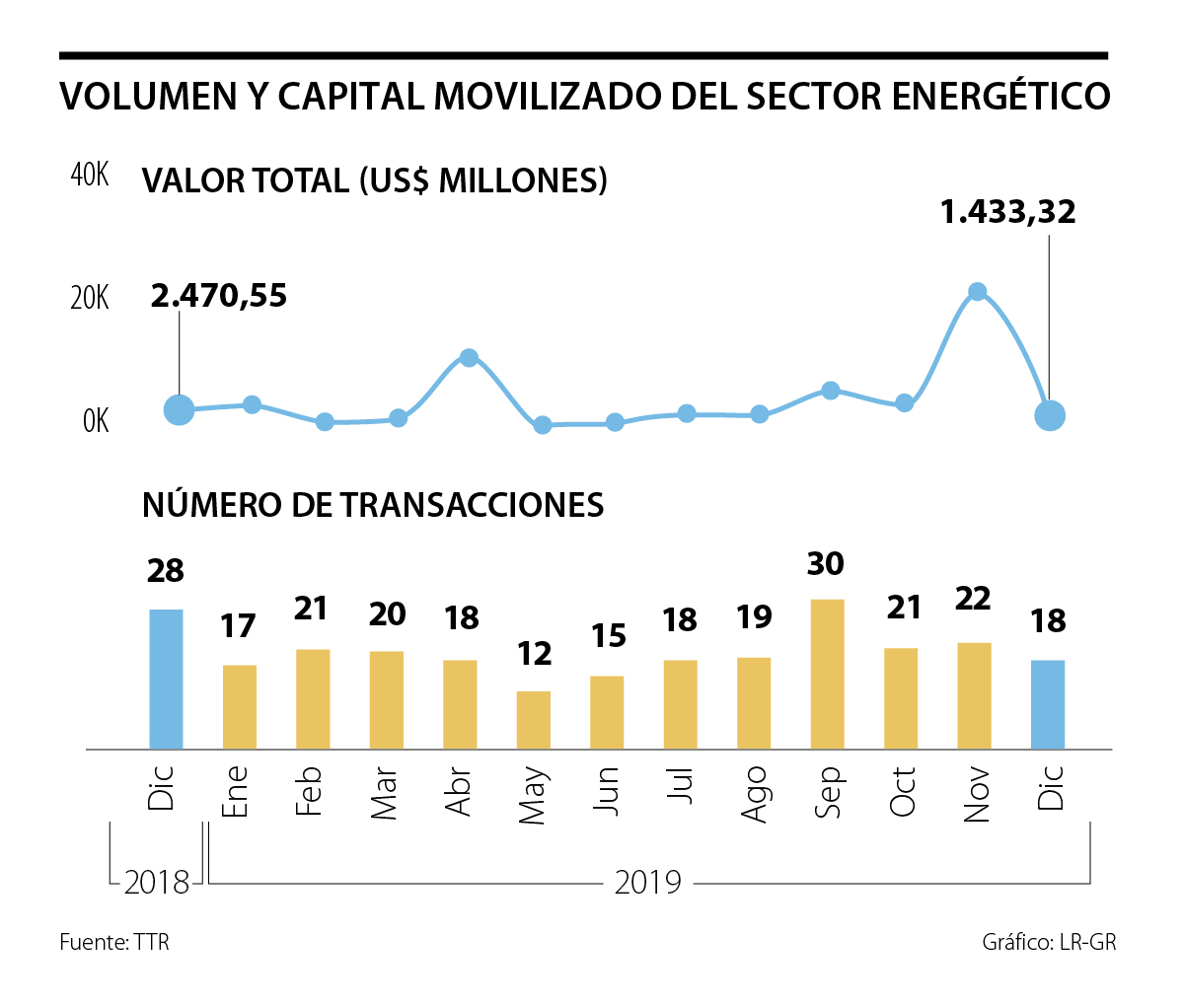 De acuerdo con el más reciente informe del sector energético en América Latina de 2019 que elabora Transactional Track Record (TTR), “el volumen de negocios en el sector energético en América Latina disminuyó 5% al cierre del cuarto trimestre de 2019, mientras que el valor agregado de operaciones ha registrado un aumento de 153% en los mismos 12 meses del año pasado”.