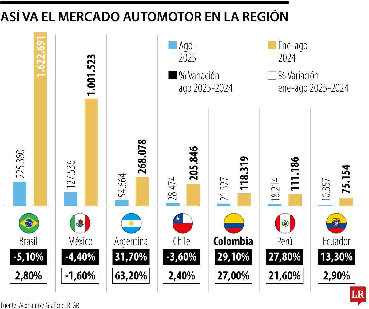En el segmento de vehículos livianos, Costa Rica y Guatemala tuvieron las mayores caídas interanuales en agosto, de 23,3%. “Mientras que, en el segmento de vehículos pesados (comerciales para Venezuela), Colombia, Venezuela y Perú presentaron incrementos en sus ventas en agosto de 2025 (75,0%, 47% y 37%, respectivamente). México, Brasil y Chile fueron los países que registraron caídas de 37,9%, 23,7% y 16% en sus ventas de vehículos pesados”, dice el ranking.