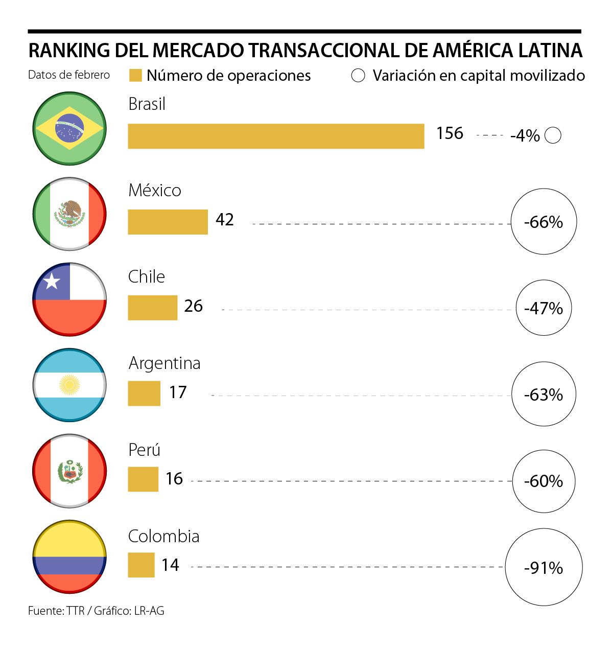 De acuerdo con el más reciente informe de TTR (Transactional Track Record) con los datos de febrero de 2020 del mercado M&A en América Latina, en la región se registraron un total de 131 fusiones y adquisiciones, por un importe agregado de US$3.773,73 millones. De acuerdo con el ranking, Brasil y México lideraron en este conteo con 156 y 42 operaciones; respectivamente.