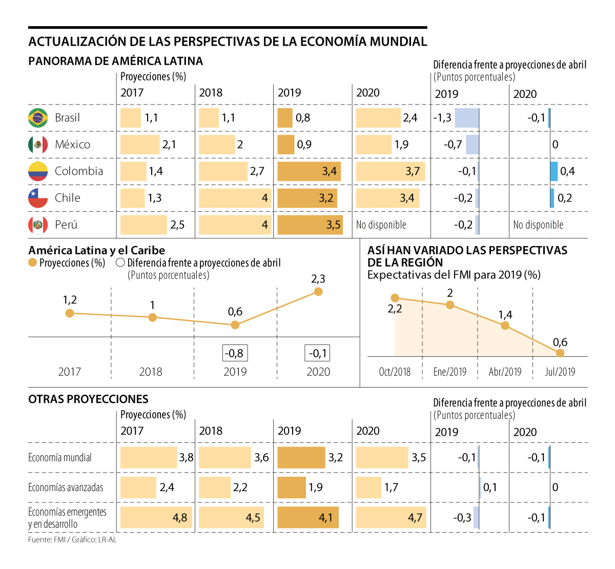 Brasil y México fueron dos de las economías relevantes a las que apuntó el Fondo Monetario Internacional para argumentar su decisión de disminuir la perspectiva de crecimiento de América Latina este año en 0,8 puntos porcentuales, en su reporte de julio. El informe actual estima que la economía en la región solo crecería 0,6% para cierre de este año, cifra que para abril se calculaba en 1,4%.