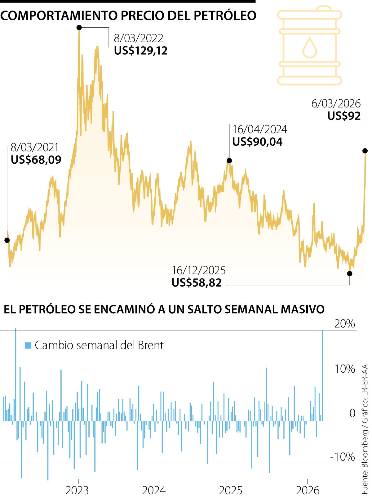 El conflicto entre EE.UU. e Irán sigue impactando mercados energéticos. La tensión ha llevado el precio del Brent a US$92 por barril, su nivel más alto desde el visto en abril de 2024