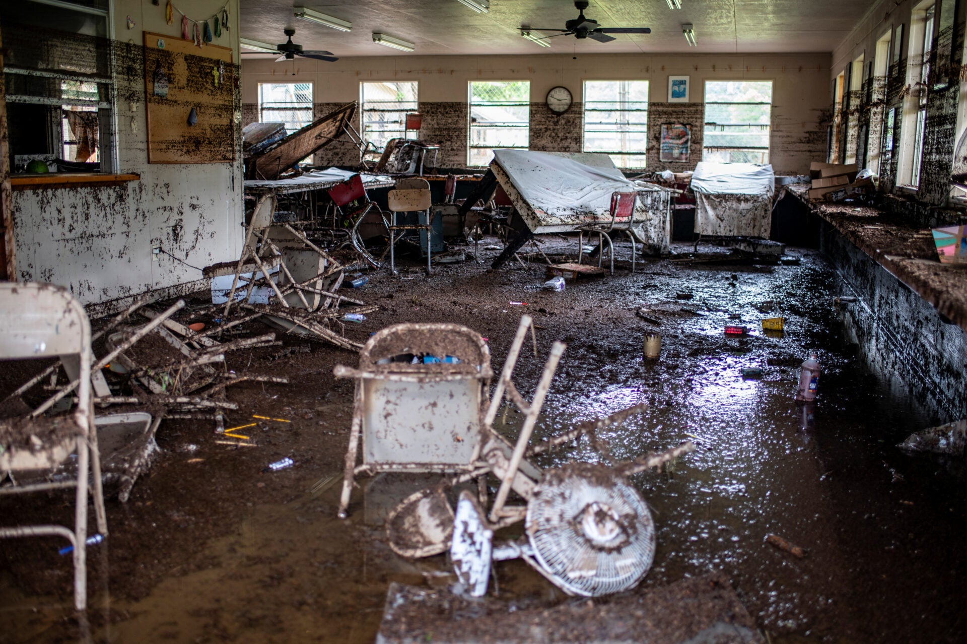 El campamento era un escenario de devastación. En el interior de una cabaña, las líneas de barro que indicaban la altura a la que había subido el agua se encontraban al menos a 1,83 metros del suelo. Había armazones de camas, colchones y objetos personales cubiertos de barro. Algunos edificios tenían ventanas rotas y a uno le faltaba una pared.