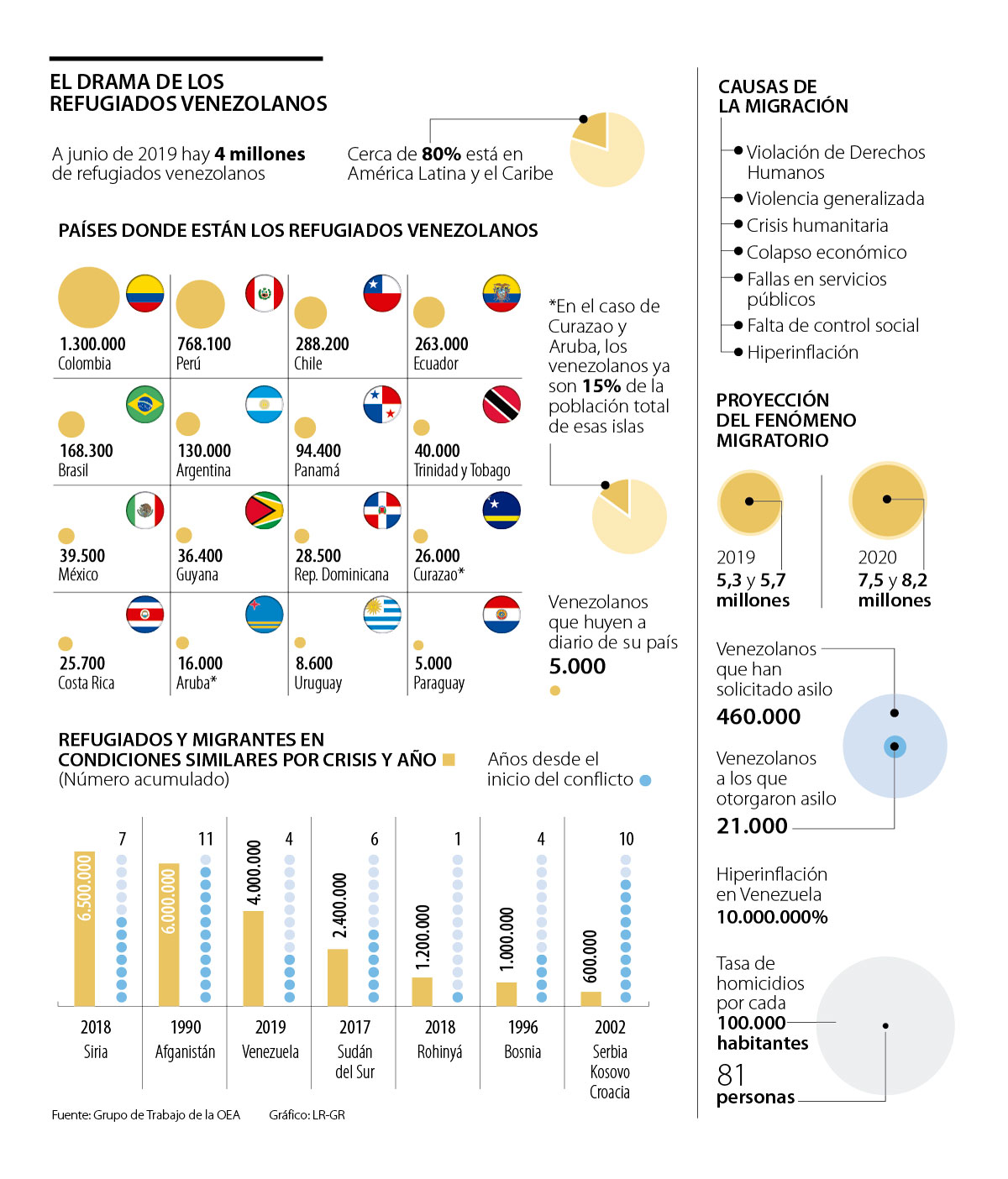 Al menos cuatro millones de venezolanos se han marchado de su territorio, lo que representa 13% de la población total del país vecino. Esta crisis humanitaria, sin precedentes, es solo comparable con la de Siria, que ha padecido una guerra por más de ocho años. Precisamente después de ese país, que registra 6,5 millones de refugiados; y de Afganistán, con 6 millones de personas; Venezuela es el tercer flujo de migrantes más grande del mundo.