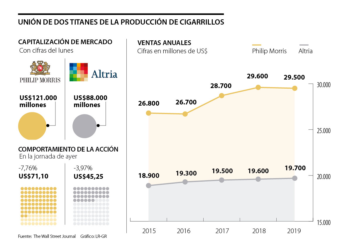 Según los precios de cierre del lunes, Philip Morris tiene una capitalización de mercado de aproximadamente US$121.000 millones, mientras que Altria tiene una capitalización de mercado de US$88.000 millones.