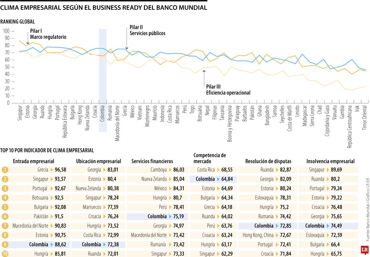 Aunque se prevé que para 2026 el Business Ready logre un alcance global (con 180 países), como su antecesor, para esta edición se evaluó a 50 países de diferentes niveles de ingresos y regiones geográficas. Entre ellos está Colombia, que logró la casilla número 12. Esta ubicación en el ranking la alcanzó con el puntaje global de los tres pilares que se califican: marco regulatorio, servicios públicos dirigidos a las empresas, y la eficiencia operativa al poner en práctica los dos primeros factores.