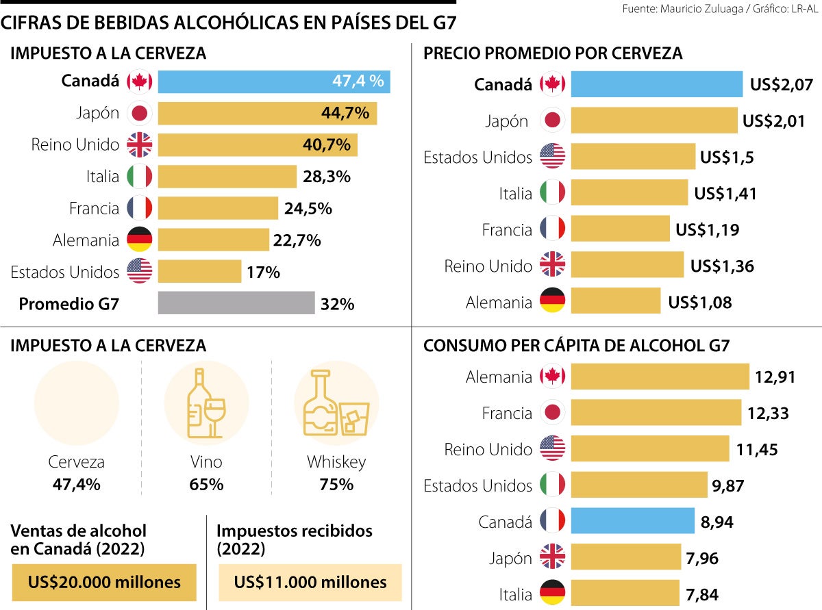 Mientras en Canadá casi la mitad del precio que una persona paga cuando se toma una cerveza va a las arcas del Estado, en Japón, segundo miembro del G7 con el mayor impuesto al alcohol, dicha proporción es de 44.7%