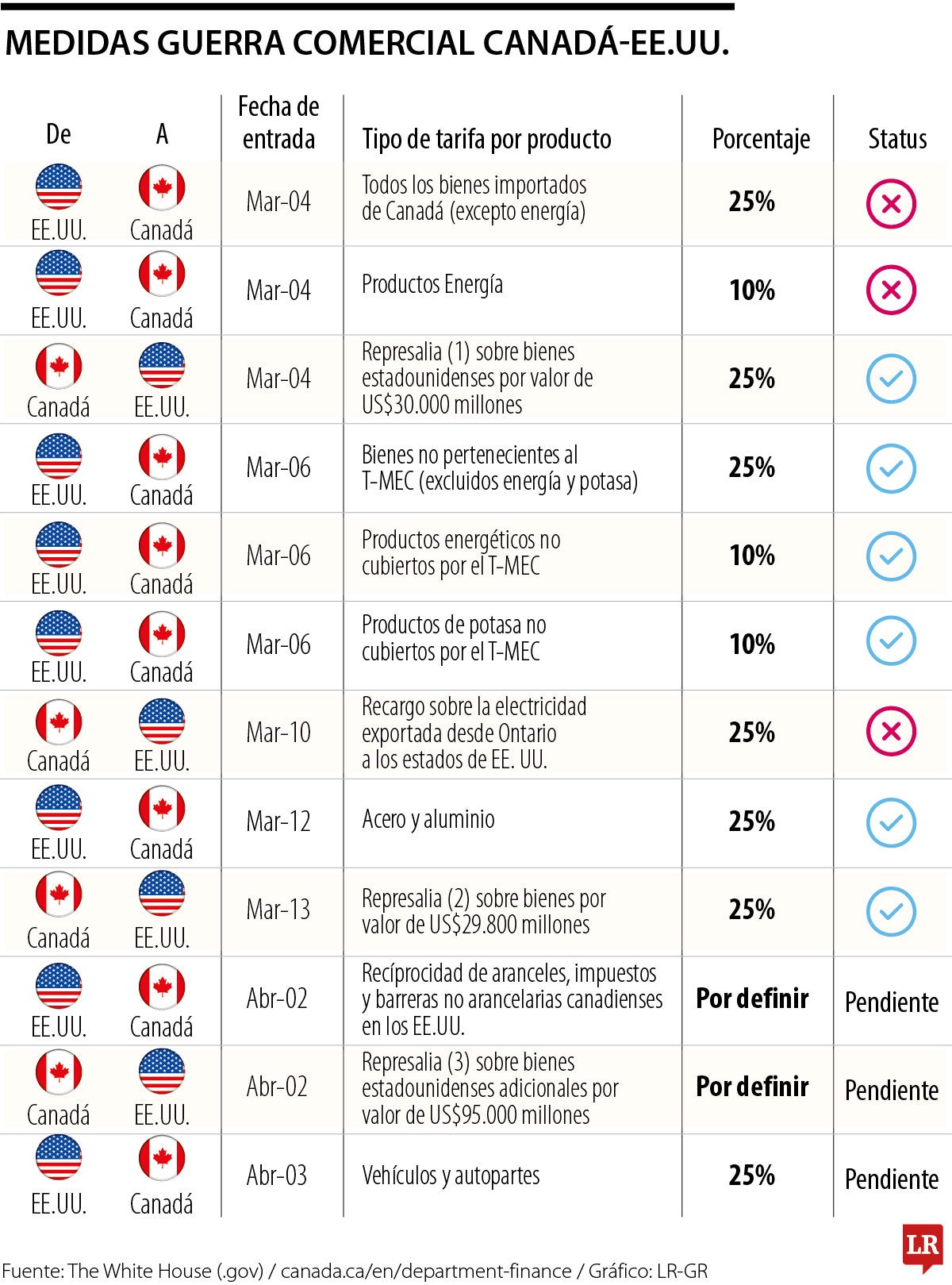 De esa docena de medidas que contemplan tarifas a bienes y servicios, ocho han sido anunciadas desde el lado de Estados Unidos, mientras que desde Canadá se han fijado cuatro acciones, tres de ellas, paquetes de represalia que podrían llegar a afectar el ingreso de diversos productos cuyo valor comercial anual suma más de US$154.000 millones.