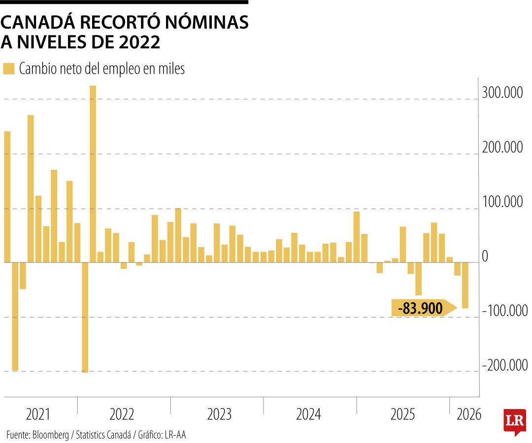 El empleo cayó en 83.900 puestos de trabajo en febrero, y las pérdidas se concentraron en el empleo a tiempo completo y en el sector privado, según datos de Statistics Canada publicados el viernes.