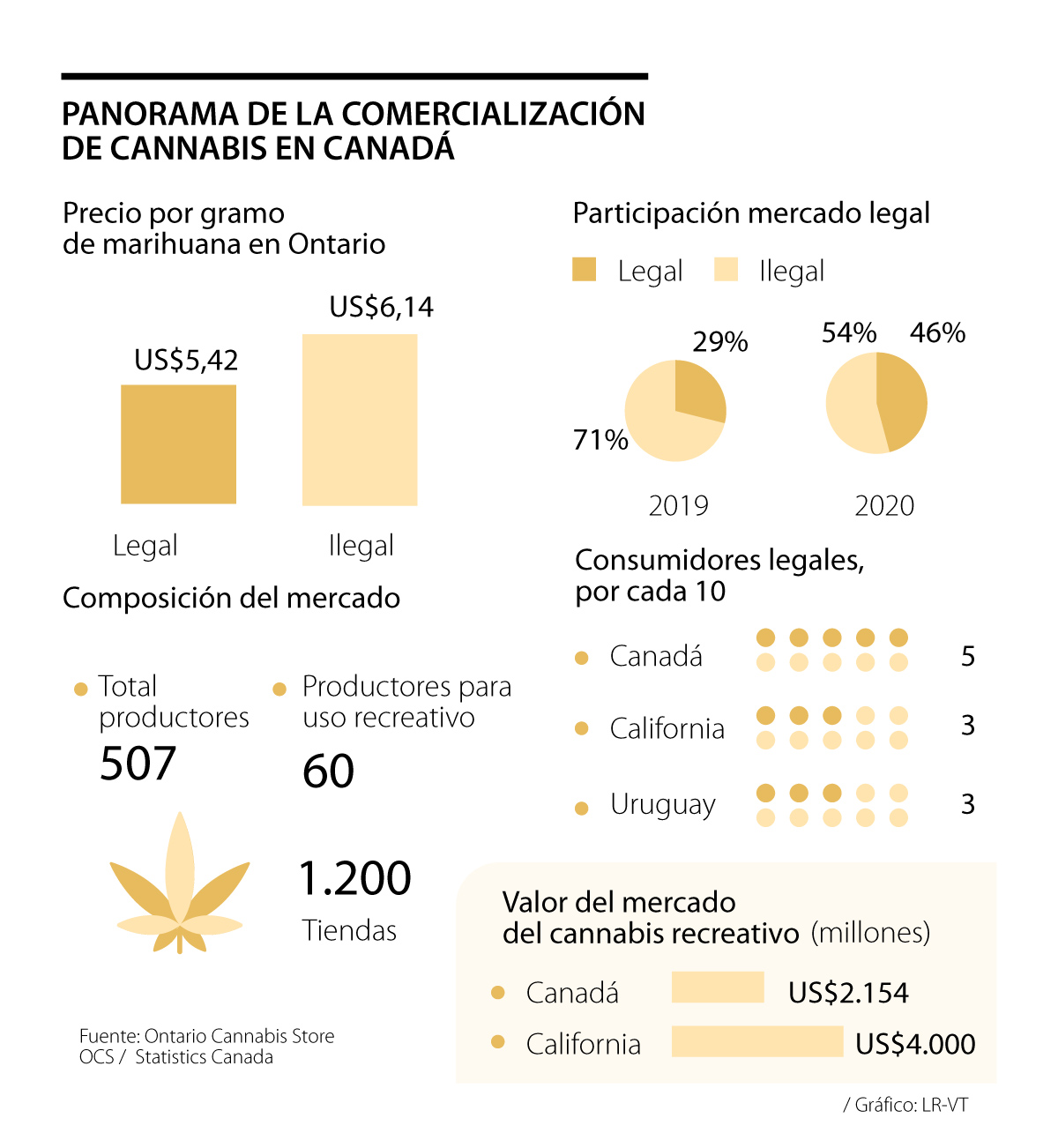 Por primera vez, Ontario Cannabis Store (OCS), vendedor mayorista y único comercializador online autorizado en esta provincia, registró un valor de venta menor al ofrecido en las calles. Para el trimestre abril-junio, el precio promedio por gramo de flor seca de marihuana, incluyendo impuestos, fue de US$5,42, en comparación con los US$6,14 del mercado ilegal. Este diferencial de 12% se da en medio de una sobreproducción importante de cannabis, pues los inventarios son cinco veces mayores al volumen de las ventas.