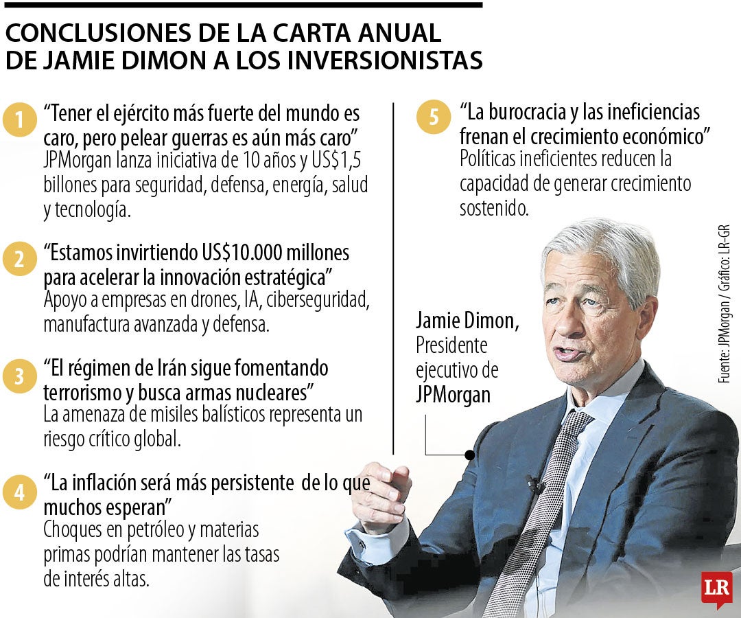 La posibilidad de una inflación más persistente y tasas de interés más elevadas de lo previsto se convirtió en la principal alerta de Jamie Dimon, presidente ejecutivo de JPMorgan Chase, quien en su más reciente carta anual a los accionistas advirtió que los conflictos geopolíticos, en especial la guerra en Irán, podrían desencadenar nuevos shocks en los precios del petróleo y las materias primas.