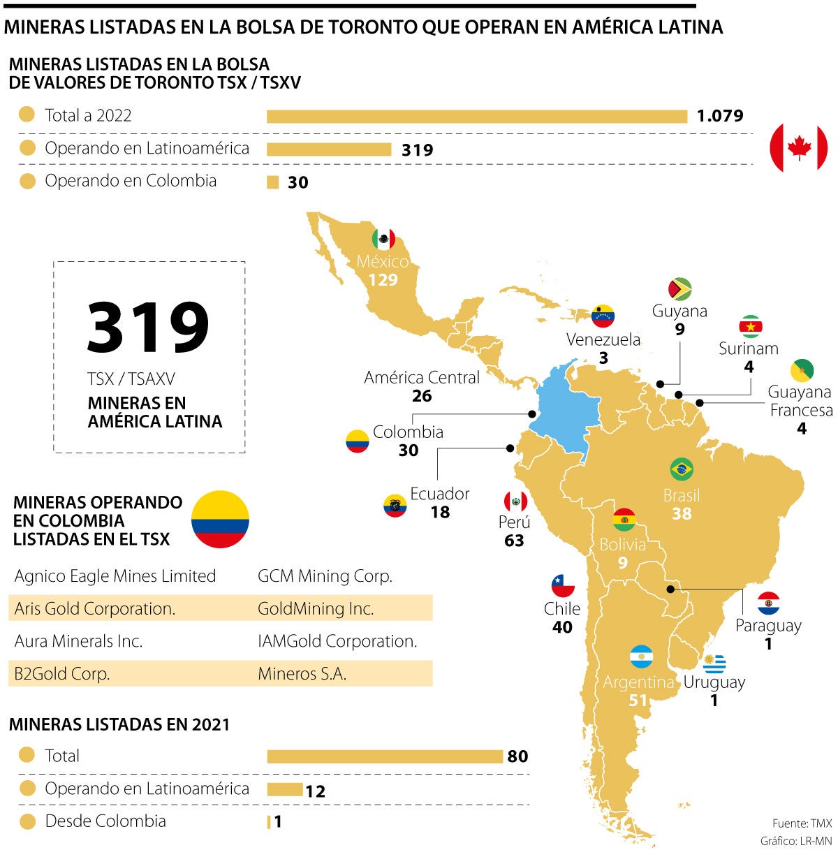 Colombia tiene una representación importante, 30 empresas, cuya acción se cotiza a diario en Toronto, lideran 59 propiedades mineras en diversas partes del territorio colombiano. El listado más reciente fue el de la compañía Mineros.