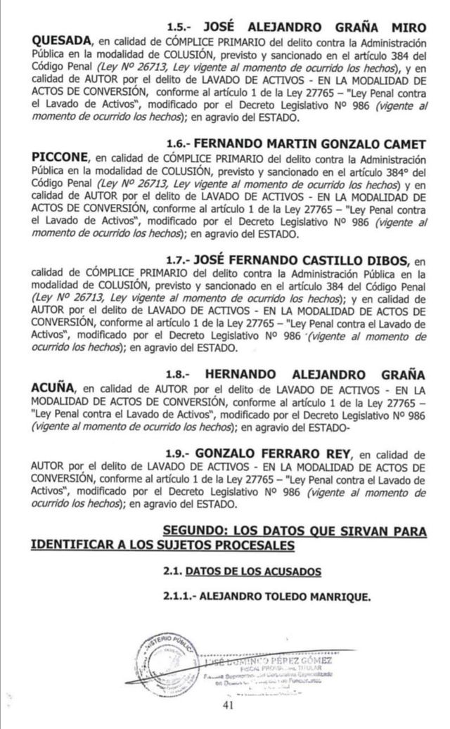 Otros acusados por Pérez son los exdirectivos de Graña y Montero Gonzalo Ferraro Rey y Hernando Graña. Sobre ellos, el fiscal pidió 11 años y 6 meses de prisión por el delito de lavado de activos.