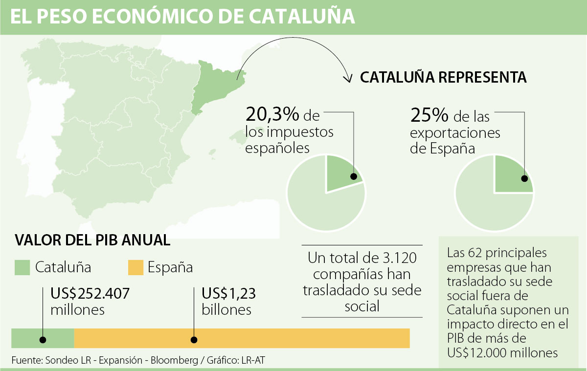Desde comienzo del año, la inversión productiva cayó 37% y en el trimestre previo al referendo de octubre disminuyó 75%. Este panorama se ha visto reforzado con el traslado de la sede social que han hecho 3.120 compañías desde que se declaró la independencia. Entre ellas, están las 62 principales empresas que, segú Expansión, representan un impacto directo al PIB de más de US$12.000 millones.