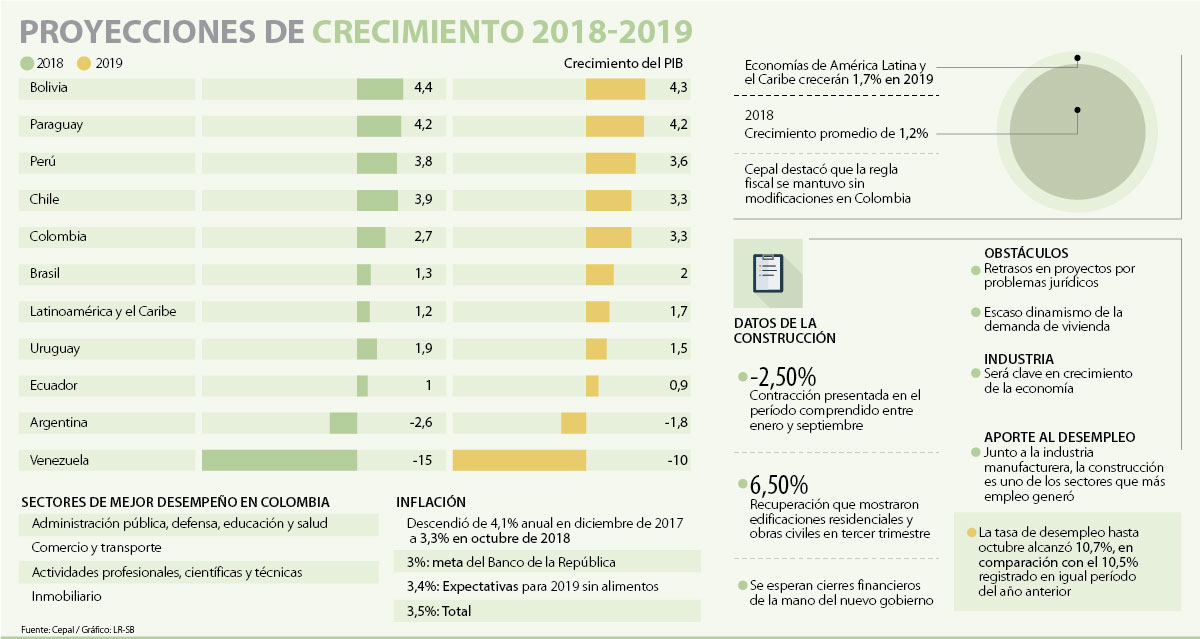 De acuerdo con el documento en el que se hace referencia a la economía local, en 2019 se prevé que el crecimiento de 3,3% sea impulsado por la inversión, al consolidarse la recuperación de algunos sectores. Uno de ellos será el de la construcción, que, según las proyecciones de la Cepal, lograría materializar de forma significativa su impacto sobre otros sectores, particularmente la industria, por los encadenamientos que hay entre ambos segmentos.