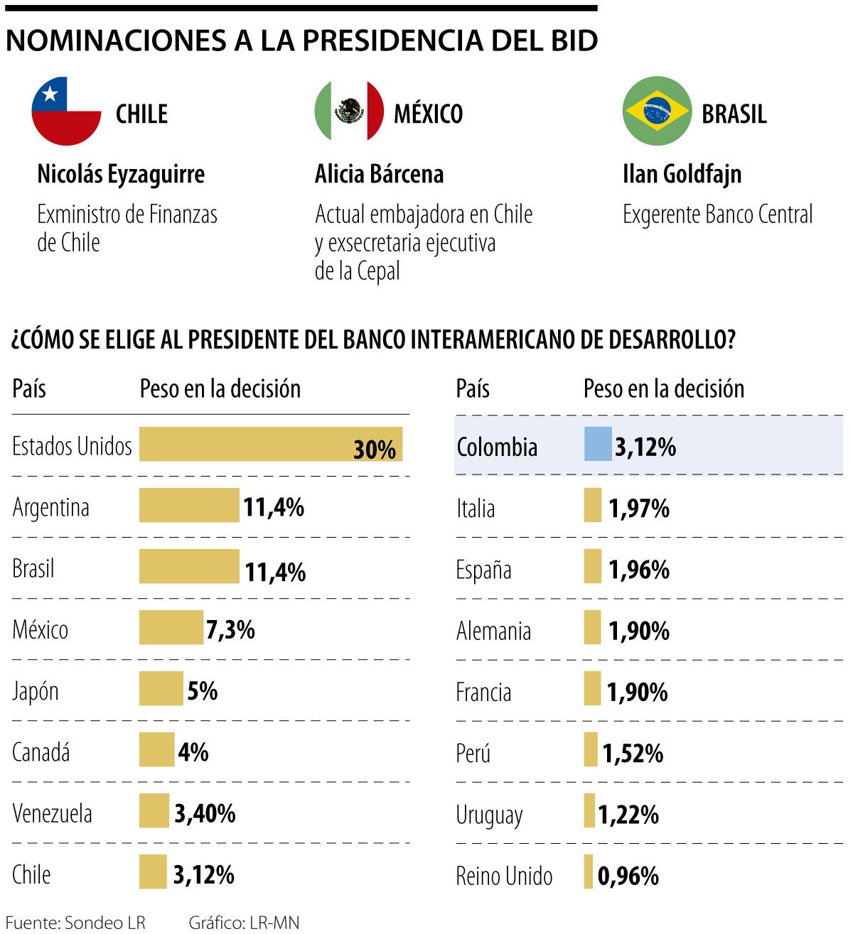 Hasta el momento en la carrera estaban fijos Ilan Goldfajn, exgerente del Banco Central de Brasil, y Alicia Bárcena, embajadora de México en Chile y exsecretaria de la Cepal. A estos nombres se suma la candidatura de Chile, que dio a conocer el ministro de Finanzas, Mario Marcel, al explicar la postulación del exministro Nicolás Eyzaguirre.