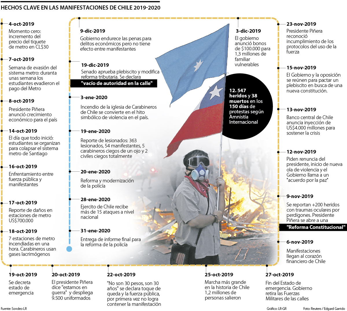 Una Asamblea Constituyente, la reforma de la Policía, el cambio de una inminente reforma fiscal, 12.547 heridos y 38 muertos, fue el saldo de un periodo de manifestaciones que se extendió por 150 días en Chile y que sacudió los cimientos democráticos que hasta ese momento regían al país austral.