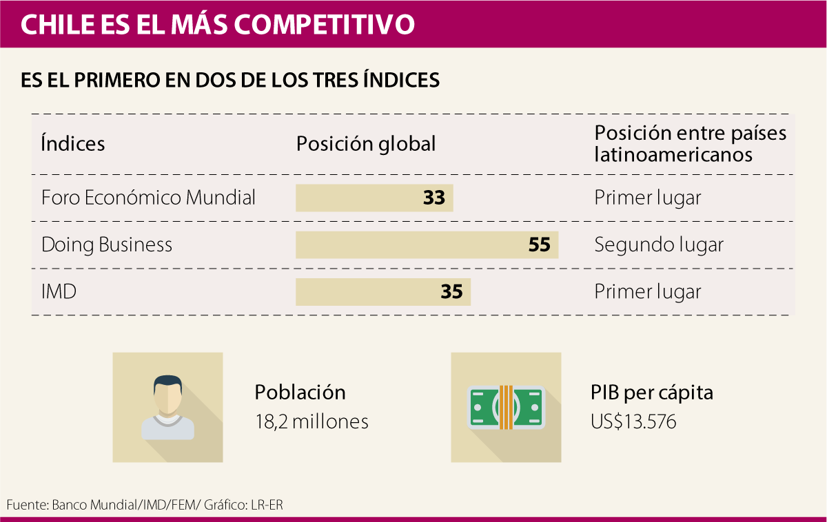En dos de los tres informes de competitividad más importantes, Chile es el de mejor rendimiento. La economía que hoy lidera Michelle Bachelet tiene el desempeño más alto de América Latina en el estudio que realiza el Foro Económico Mundial (FEM) y en el del International Institute for Management Development (IMD). Aunque México lidera el Doing Business del Banco Mundial, Chile está en la segunda posición de la región.