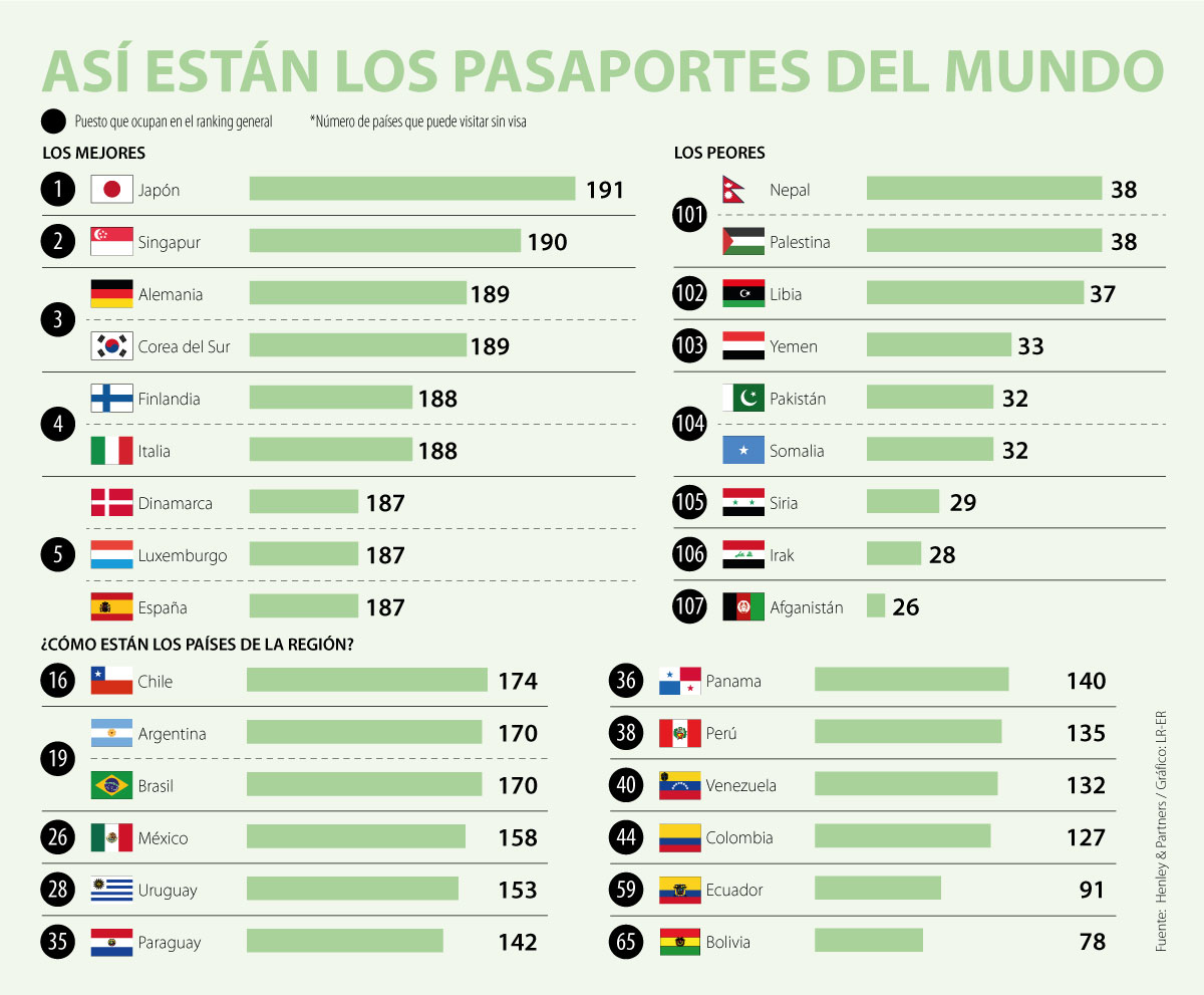 Más adelante en el ranking están Italia y Finlandia, en la cuarta posición, con ingreso inmediato a 188 territorios, cada uno. Cerrando el top cinco de los países con el pasaporte más atractivo a nivel mundial se encuentran Dinamarca, Luxemburgo y España que ocupan el puesto cinco gracias a que cuentan con un pasaporte que permite acceder a 187 naciones. (Ver gráfico)