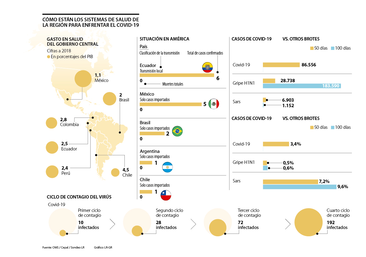 La capacidad exponencial de contagio de este virus se evidencia en que en tan solo 50 días ha dejado 86.556 infectados, mientras que el H1N1 contagió 28.738 y el Sars 6.903 durante el mismo periodo. Con base en estas cifras que muestran el alcance del brote, LR analizó cómo están los sistemas de salud de los países de la región y cuáles medidas se están adoptando para contener la propagación.