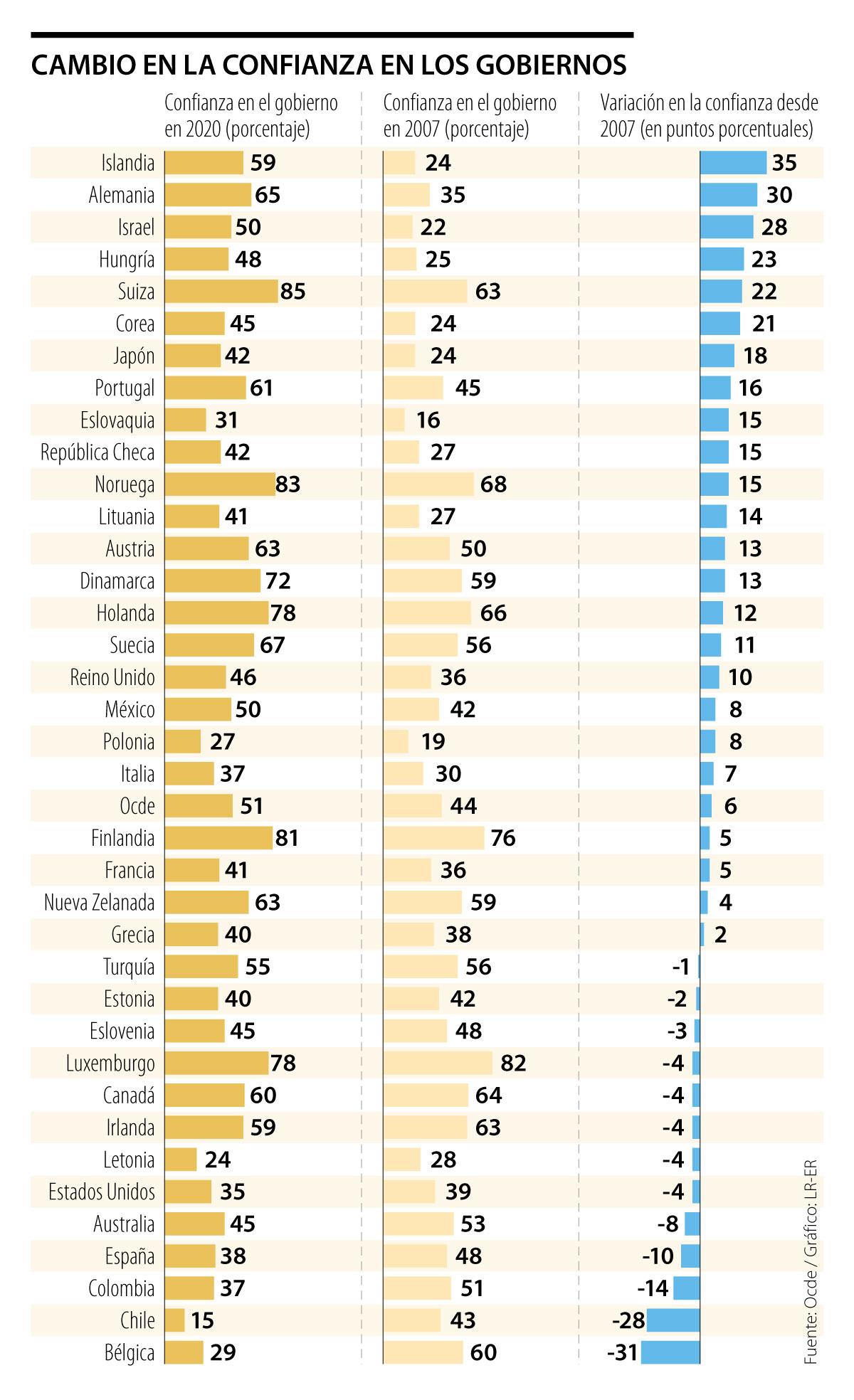 De acuerdo con el informe, entre 2007 y 2020, la confianza de los ciudadanos de Bélgica en su gobierno cayó 31 puntos porcentuales; seguido de Chile, que reportó un perdida de 28 puntos; Colombia, en tercer lugar, con 14 puntos; España (10 p.p), en cuarta posición; y, cerrando el top cinco, se encuentra Australia (8 p.p).